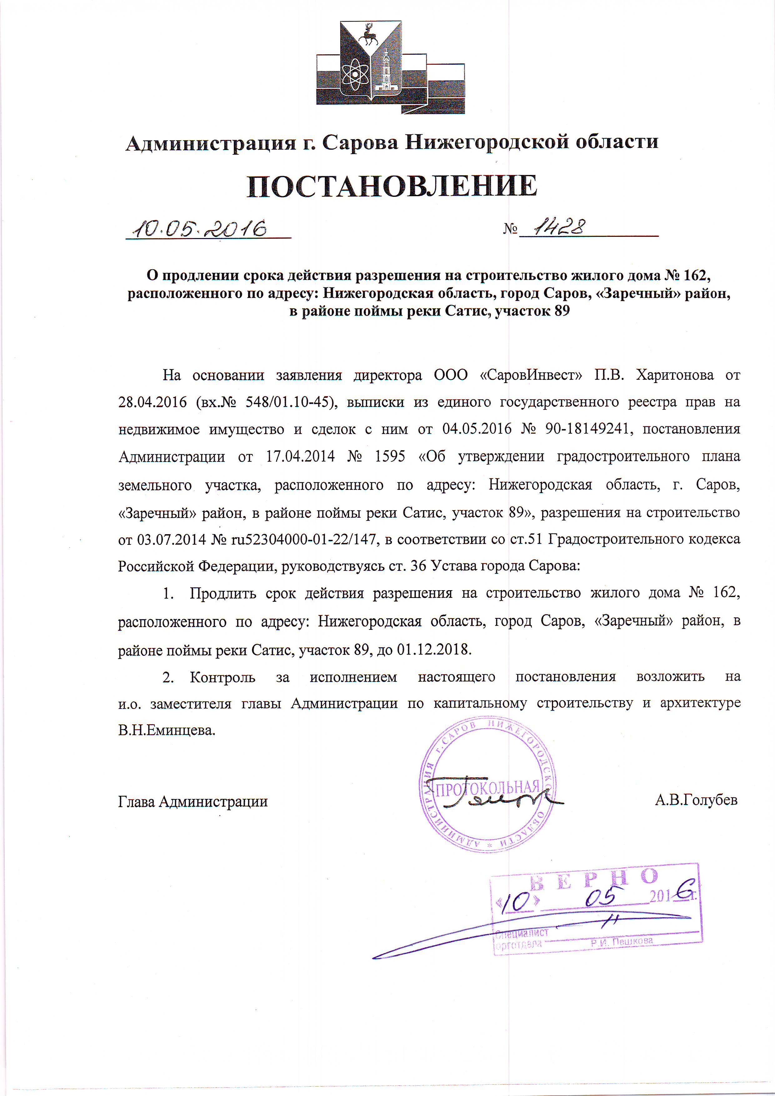 Постановление о продлении разрешения на строительство на участке №89 в пойме р. Сатис, дом №162