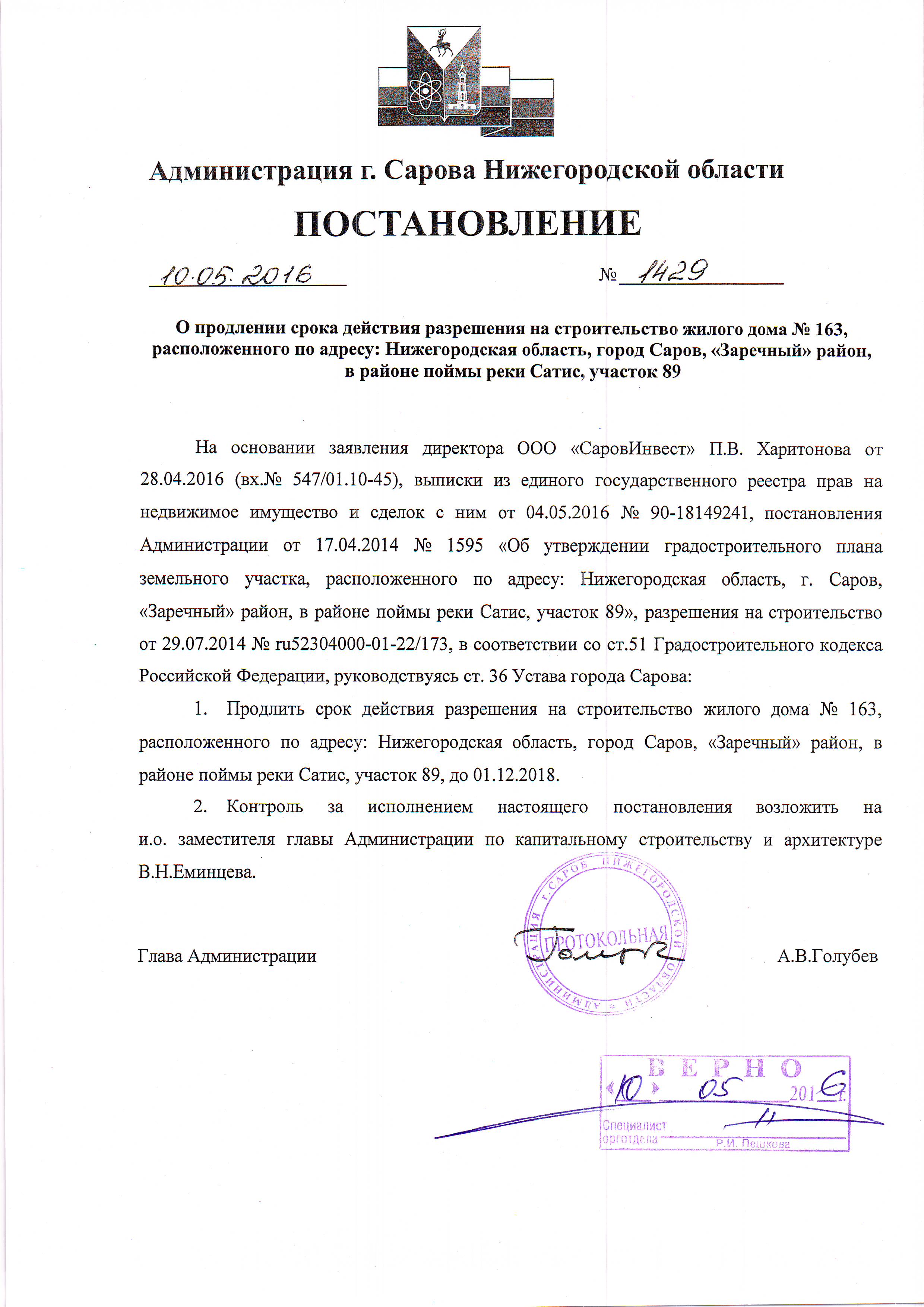 Постановление о продлении разрешения на строительство на участке №89 в пойме р. Сатис, дом №163